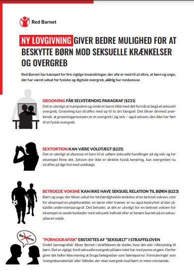 Red Barnet har kæmpet for fire vigtige ændringer i straffeloven, som alle beskytter børn bedre mod seksuelle krænkelser og overgreb. Samtidig sætter de en tyk streg under, at et barn aldrig kan give samtykke til en seksuel relation til en voksen. Hverken på sociale medier, på efterskolen eller i fodboldklubben.